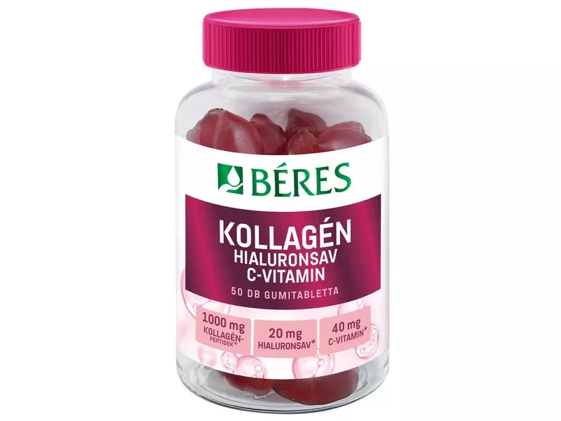 Béres Kollagén, Hialuronsav, C-vitamin cukormentes gumitabletta étrend-kiegészítő készítmény édesítőszerekkel, finom eper ízben.