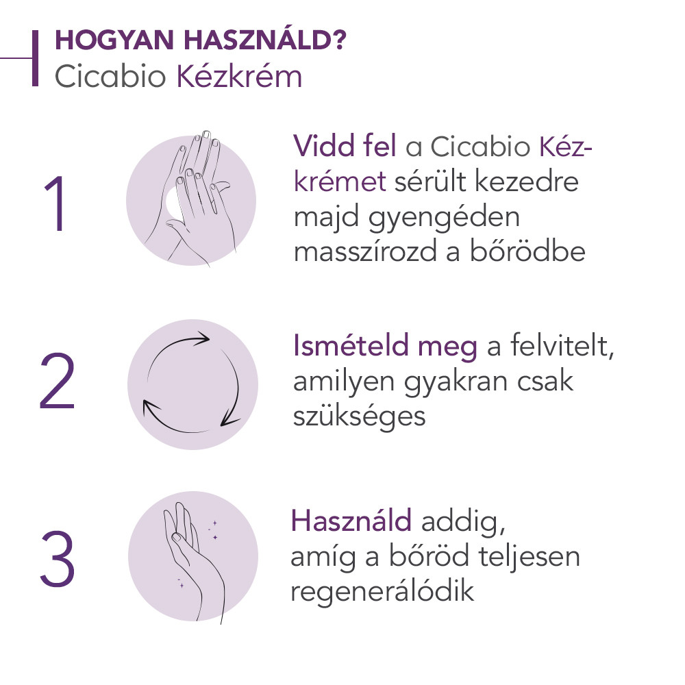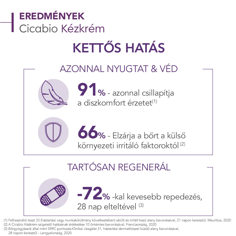 - A Cicabio Kézkrém a bőrön védőréteget képezve segíti elő az epidermisz helyreállítását.