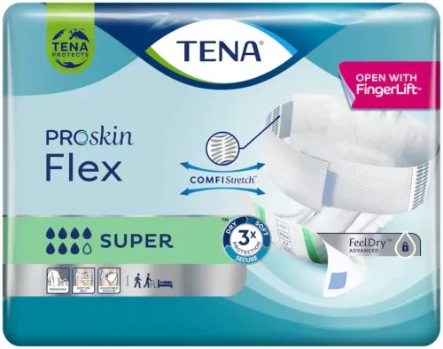 A kimagasló védelem érdekében a FeelDry Advanced™ technológiával ellátott TENA ProSkin Flex gyorsan magába szívja a felületére került nedvességet, így szárazon tartja a bőrt. A szuperabszorbens, gyorsan aktiválódó mag hamar magába zárja az akár nagy mennyiségű vizeletet is, így szárazon tart, míg a teljesen légáteresztő ConfioAir™ hátoldali rétegen keresztül jól tud szellőzni a bőr. A felsorolt funkciók hozzájárulnak a bőr természetes egészségi állapotának fenntartásához. Az állítható ComfiStretch övvel biztosítható a testet követő illeszkedés és ezáltal a fokozott kényelem, valamint a lehetséges szivárgások hatékonyabb kivédése. A használat megkönnyítése érdekében az öv könnyen nyitható tépőzárral rendelkezik, amelyet elöl lehet rögzíteni. Az öv teljes mértékben állítható, így a termék többféle testalkathoz is illeszkedik.