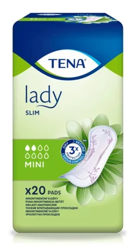 A TENA Lady Slim betét diszkrét és biztonságos védelmet jelent enyhe vizelettartási panaszok esetén. A puha betét érzékeny hólyaggal élő nőknek készült, és hármas védelmet biztosít a szivárgások, a kellemetlen szagok és a nedvesség ellen – így akár 12 órán át tartó száraz érzést garantál Önnek. A TENA Lady Slim Mini betét váratlan vizeletszivárgás esetén ideális megoldás. Ha Ön emellett dönt, biztosra mehet: a betét egyszerre kellően biztonságos és diszkrét. Szárazon tart. A TENA-tól megszokott biztonság.