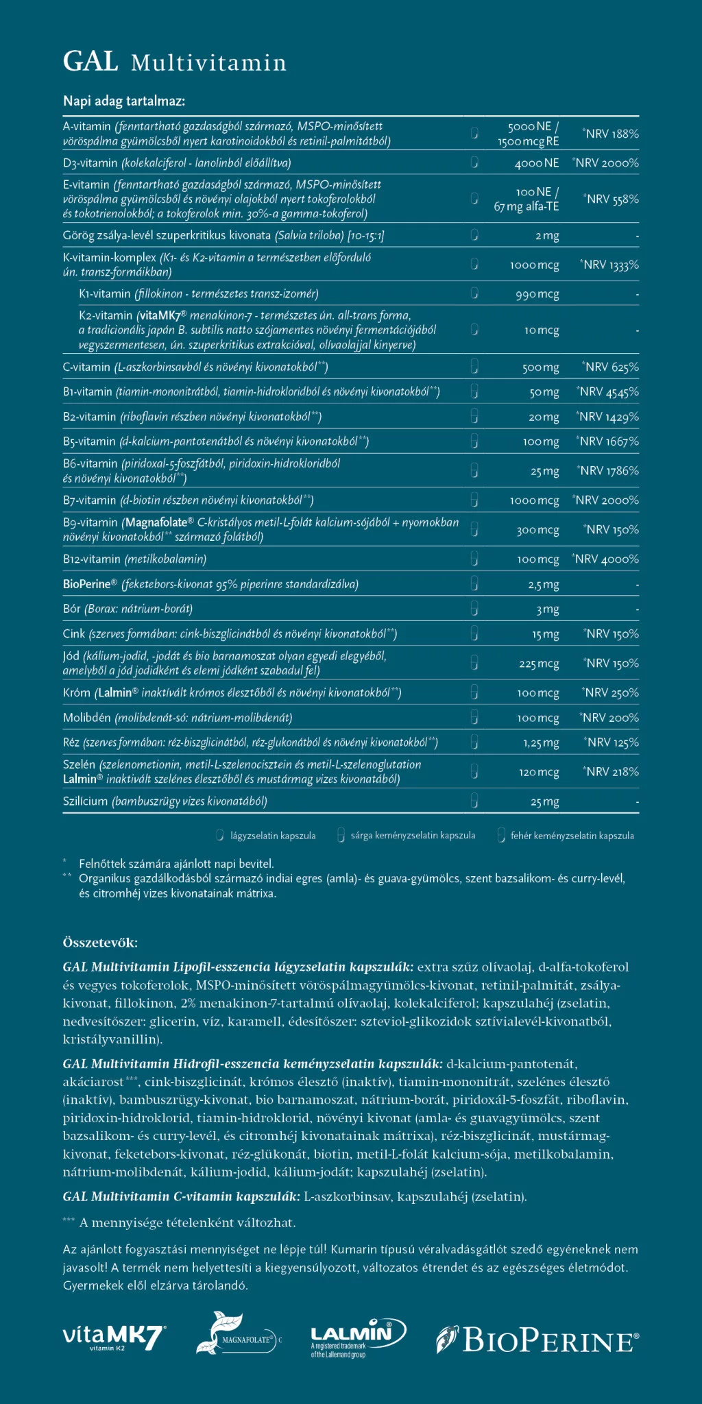 GAL Multivitamin Hidrofil-esszencia keményzselatin kapszulák: d-kalcium-pantotenát, akáciarost, cink-biszglicinát, krómos élesztő (inaktív), tiamin-mononitrát, szelénes élesztő (inaktív), bio bambuszrügy-kivonat, bio barnamoszat, nátrium-borát, piridoxál-5-foszfát, riboflavin, piridoxin-hidroklorid, tiamin-hidroklorid, bio növényi kivonat (amla- és guavagyümölcs, szent bazsalikom-, és curry levél, és citromhéj-kivonatainak mátrixa), réz-biszglicinát, bio mustármag-kivonat, feketebors-kivonat, réz-glükonát, biotin, metil-L-folát kalcium sója, nátrium-molibdenát, kálium-jodid, metilkobalamin, kálium-jodát, kapszulahéj: zselatin.