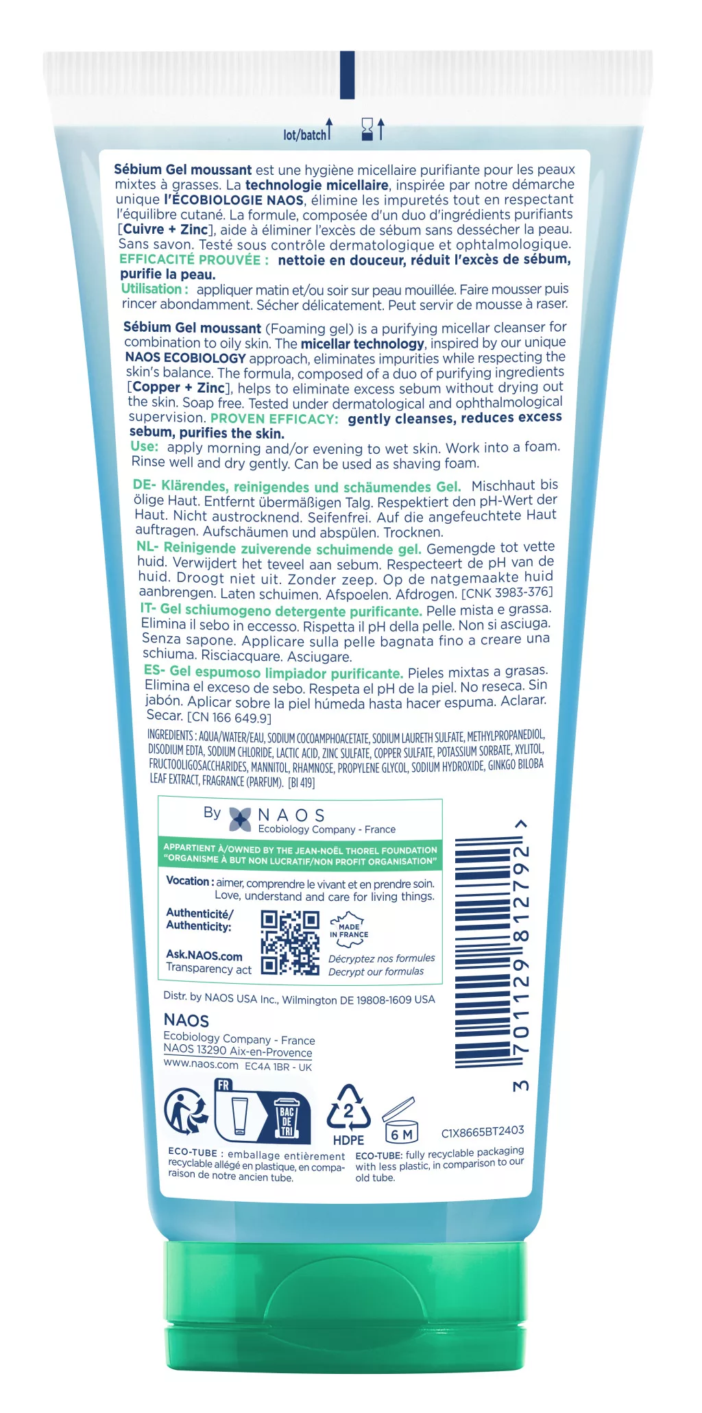 AQUA/WATER/EAU, SODIUM COCOAMPHOACETATE, SODIUM LAURETH SULFATE, METHYLPROPANEDIOL, DISODIUM EDTA, LACTIC ACID, ZINC SULFATE, SODIUM CHLORIDE, COPPER SULFATE, POTASSIUM SORBATE, XYLITOL, FRUCTOOLIGOSACCHARIDES, MANNITOL, RHAMNOSE, PROPYLENE GLYCOL, SODIUM HYDROXIDE, GINKGO BILOBA LEAF EXTRACT, FRAGRANCE (PARFUM). [BI 418].