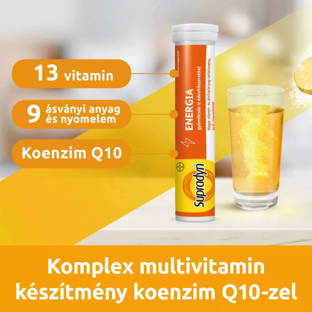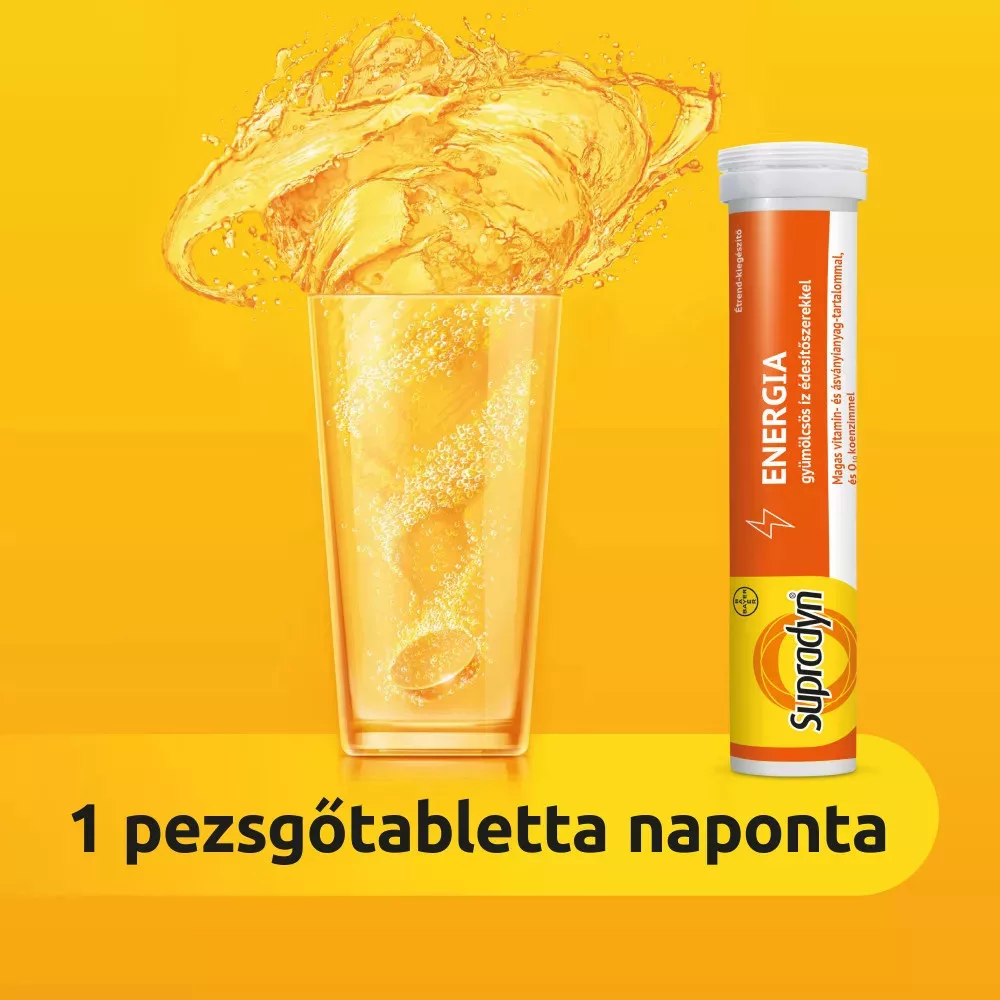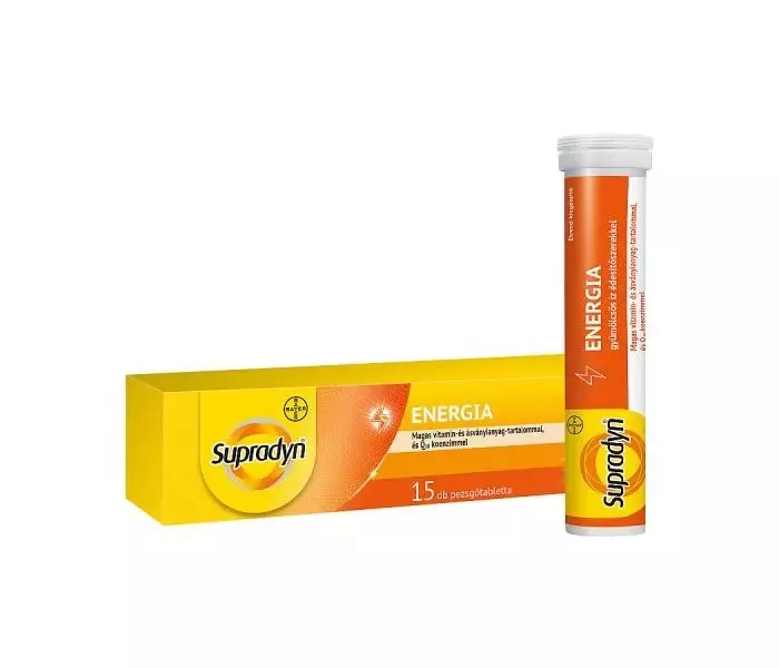 A Supradyn Energia pezsgőtablettát speciálisan az aktív életet élő emberek számára fejlesztették. Azon vitaminokat és ásványi anyagokat tartalmazza, amelyekre a szervezetnek minden nap szüksége van.