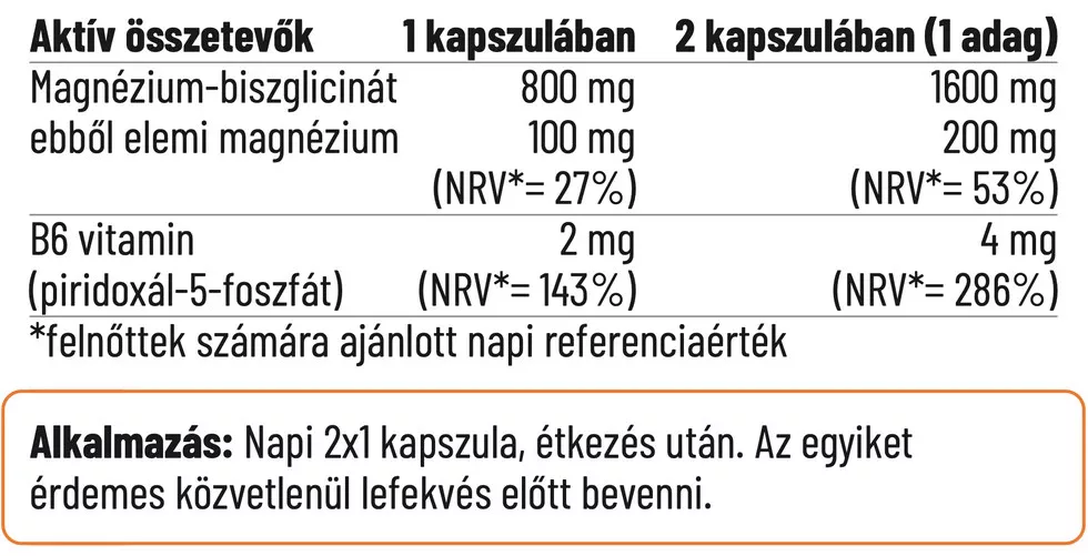Szerves, kelát kötésű magnézium-biszglicinát, melyet a B6-vitamin bioaktív formájával, piridoxál-5-foszfáttal egészítettünk ki a kiváló hasznosulásért.