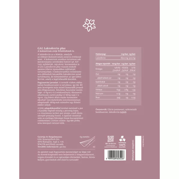 A GAL készítménye 100% tisztaságú laktoferrin-tartalmú kivonat, amelyben mind a háromféle laktoferrin megtalálható, méghozzá nagyobb részben a legértékesebb apo-laktoferrinnel. Kiemelten segíti az immunrendszer megerősítését, a káros baktériumok, vírusok és gombák kiirtását, kezeli a vérszegénységet, a bél gyulladásait, a bőrproblémákat.