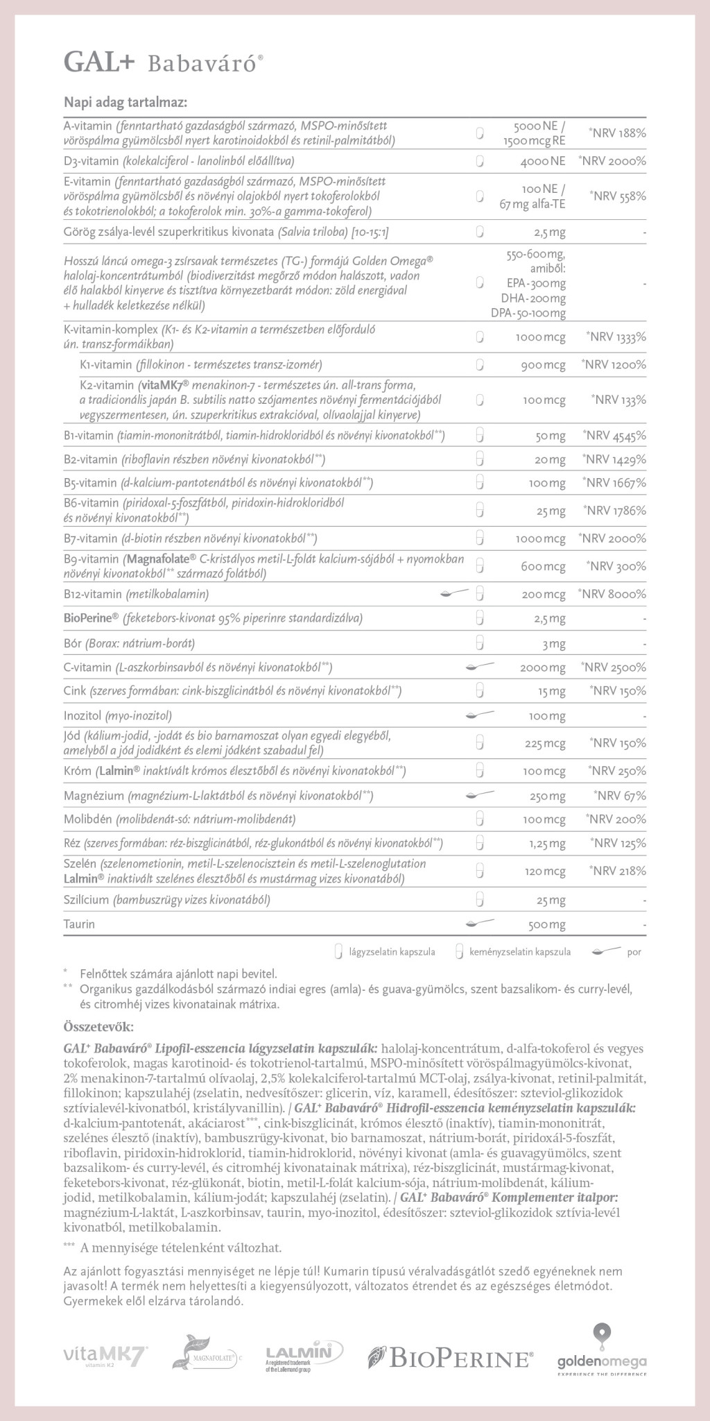 Vasat ne szedjen, csak ha igazoltan vashiányos, de még akkor is érdemes 1-2 hónap GAL+ Babaváró® szedése után újra ellenőrizni, mert nem kizárt, hogy mellette vas nélkül is rendeződik a szintje, főleg, ha rendszeresen fogyaszt mellette májat, és esetleg laktoferrint is. B3-vitamint a termékünk nem tartalmaz, mivel abban szinte mindenki táplálkozása bővelkedik, és a többlet sokaknak előnytelen lenne.